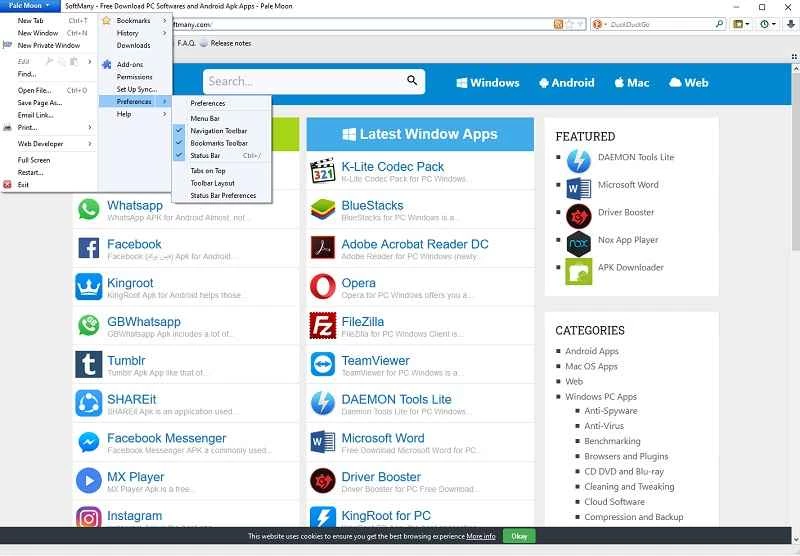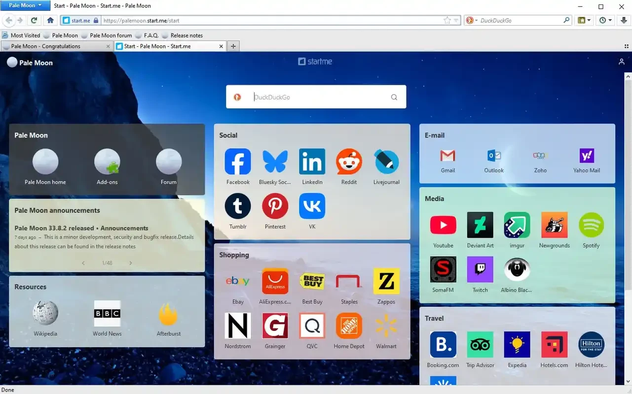 Pale Moon rappresenta la migliore combinazione di personalizzazione, stabilità e velocità, con il suo motto "Il tuo browser, a modo tuo". È stato creato come fork di Mozilla Firefox e presenta numerose funzionalità e ottimizzazioni selezionate , ma la differenza principale è l'usabilità, poiché Firefox utilizza la modalità multiprocesso per l'esecuzione, mentre Pale Moon utilizza la modalità a processo singolo. Ora utilizza il motore di ricerca Goanna e offre una pagina iniziale personalizzabile con la collaborazione di start.me. Il motore predefinito è DuckDuckGo, anziché Google o Yahoo. Allo stesso modo, utilizza il servizio IP-API, anziché i motori di geolocalizzazione di Google.